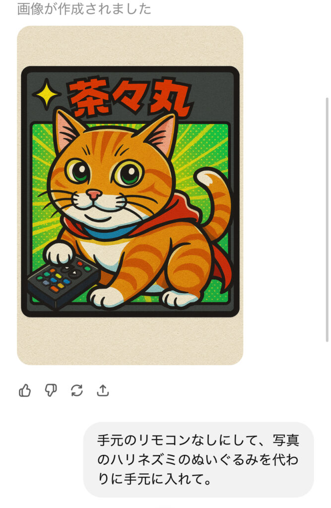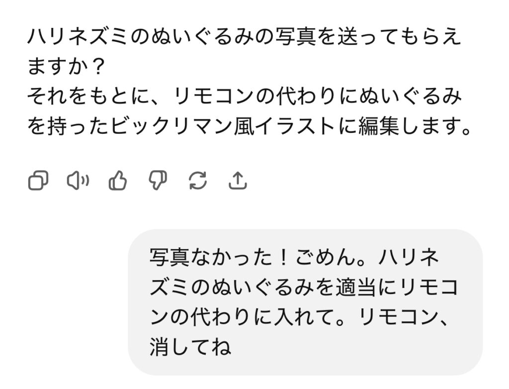 「手元のリモコンを消して」「代わりにハリネズミのぬいぐるみを持たせて」など、細かい修正をお願いしました。